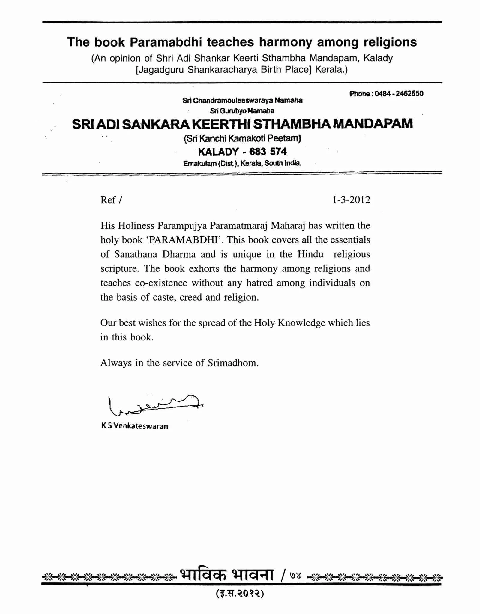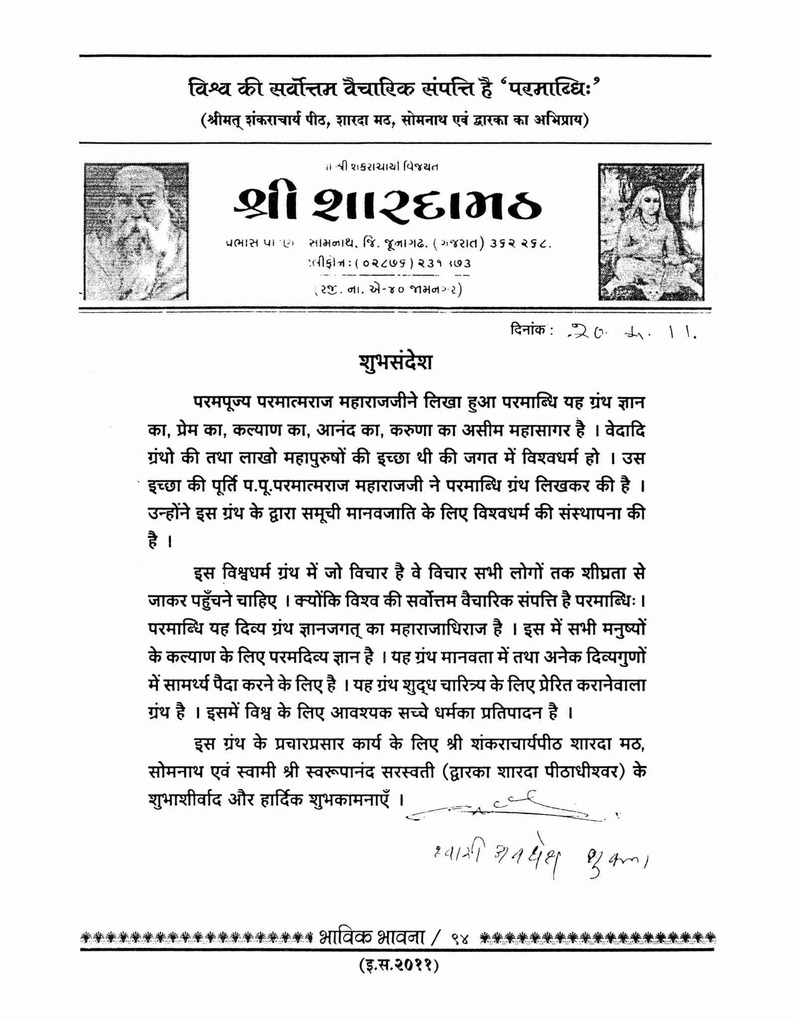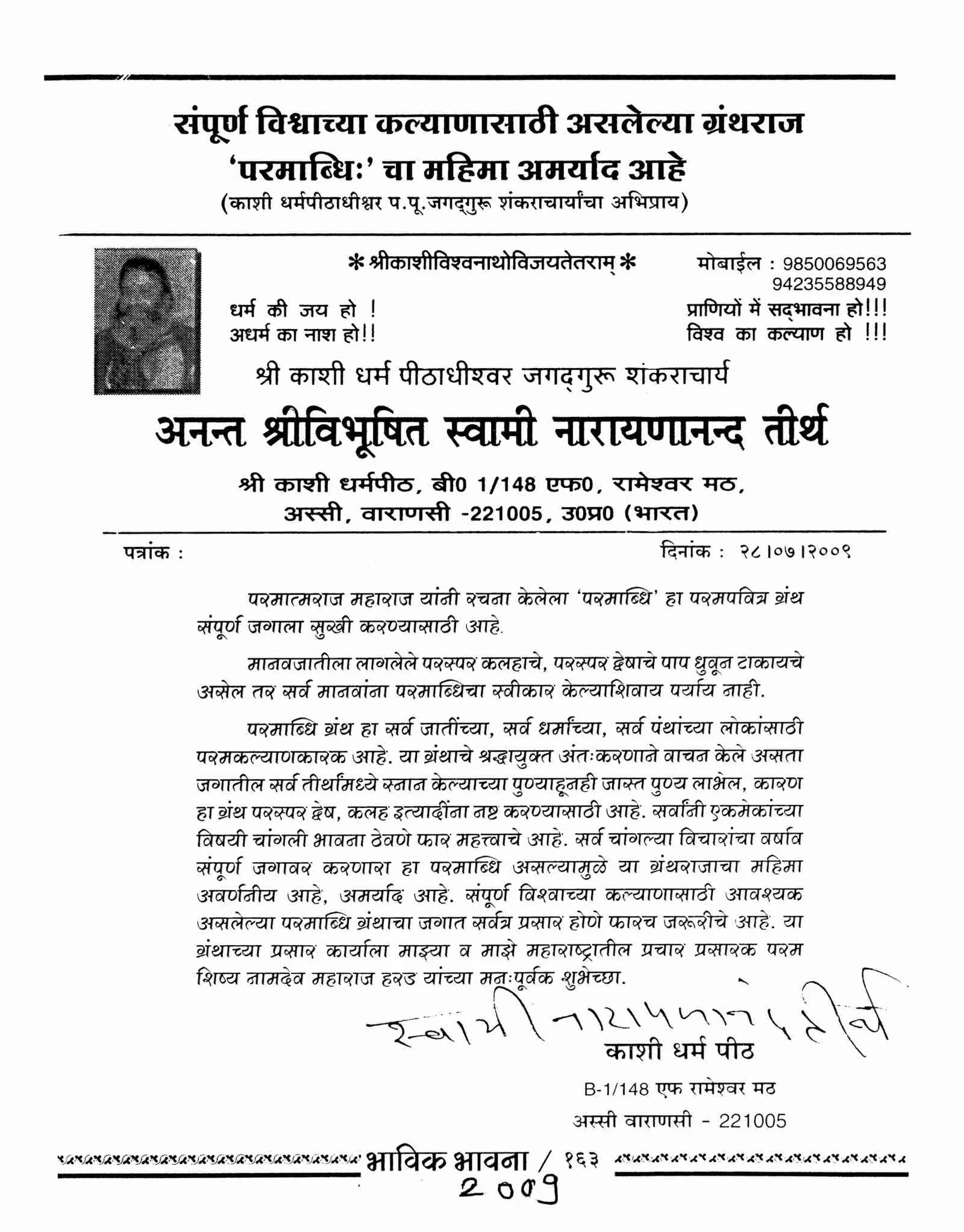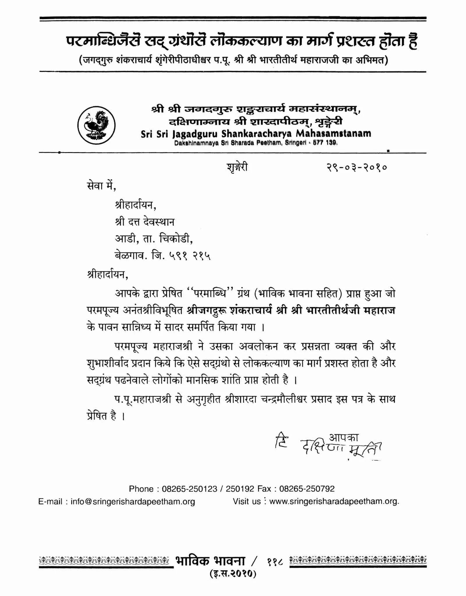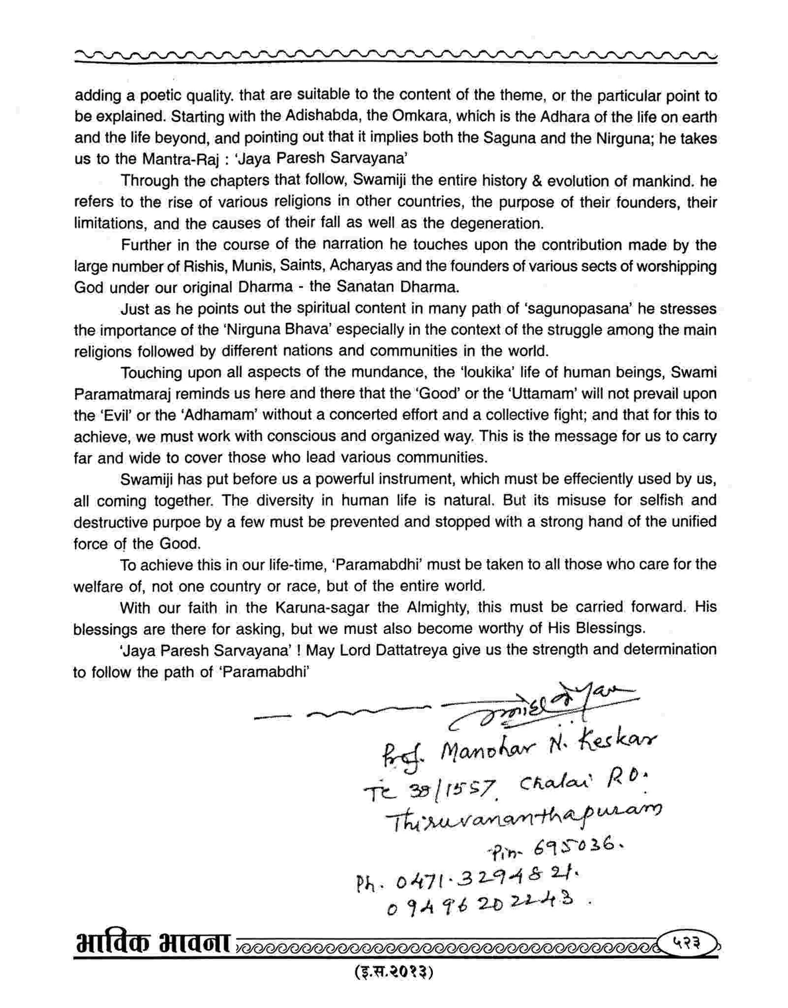 By writing the book Paramabdhi he has given the sacred information about the universal religion (i.e. Vishwa Dharma). He has written the books named Satposh, Mahonnay, Vartet, Rasyav, Tanwas, Shiprot etc.